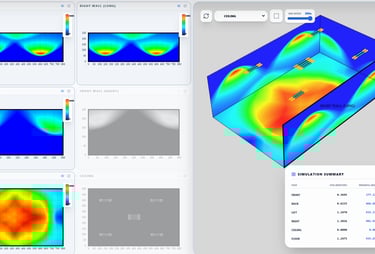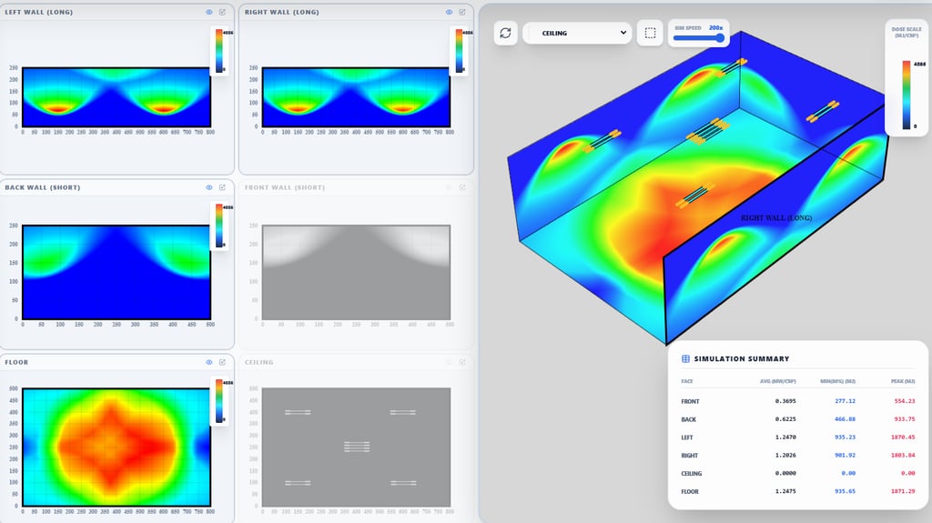 3D irradiance and dose simulations to simulate UV-C light behavior and distribution,with safety and aging factors.