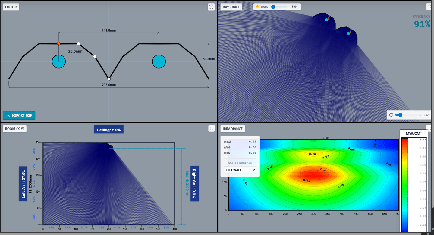 Iterating to change configuration, optimize placement, types/number of lamps is also a matter of minutes.