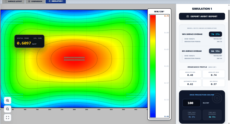 Within minutes of configuration to your project needs, you can get a first irradiance/dose/time visualisation.